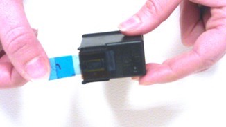 - Poté sejměte z kazety plastový ochranný klip (obr.1) a šetrně odstraňte ochranou folii (obr.2). V některých případech je kazeta chráněna pouze jednou z těchto dvou ochran.