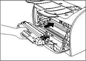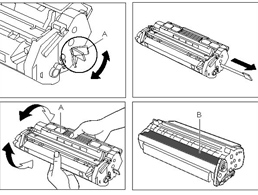 Vypněte tiskové zařízení a poté otevřete kryt pro výměnu tiskové kazety (obr.1). Vyjměte tiskovou kazetu z ochranné PE fólie tak, aby nedošlo k jeho mechanickému poškození vlivem neopatrné manipulace. V případě, že je tisková kazeta opatřena ochrannou transportní páskou (obr.2., obr.3.), zatáhněte za konec pásky, až dojde k jejímu úplnému vytažení a oddělení od kazety. Několikrát protřepejte kazetu (obr.4. A) a poté ihned zasuňte do tiskového zařízení. Zavřete kryt a zapněte tiskárnu. Pokud kontrolka na tiskárně svítí zeleně, proběhla výměna bez problému. V opačném případě zkontrolujte, zda je kazeta správně vložena a zkuste jí znovu instalovat. Event. hlášení tiskárny o neoriginální kazetě je běžné a uživateli nijak neznemožňuje tisk.
